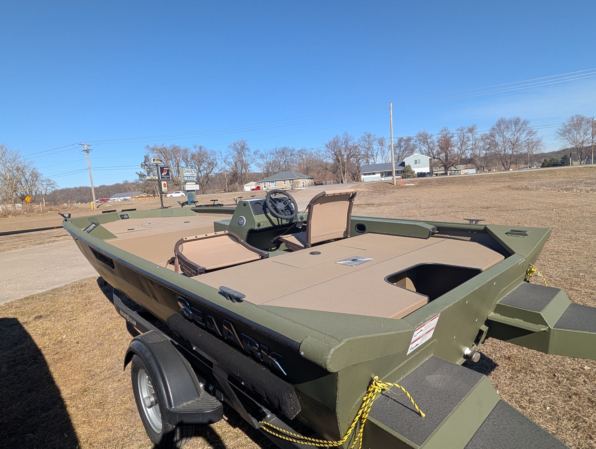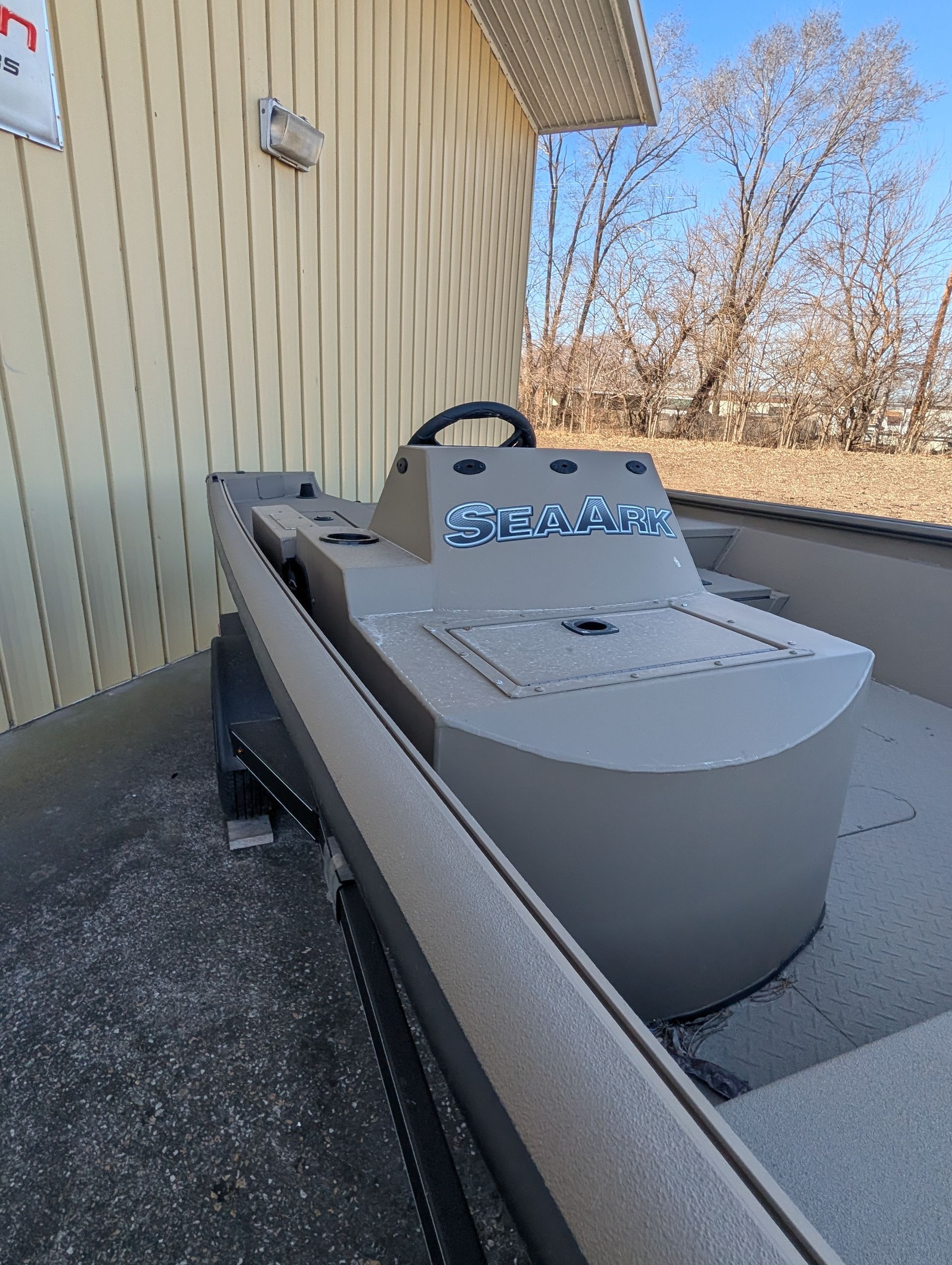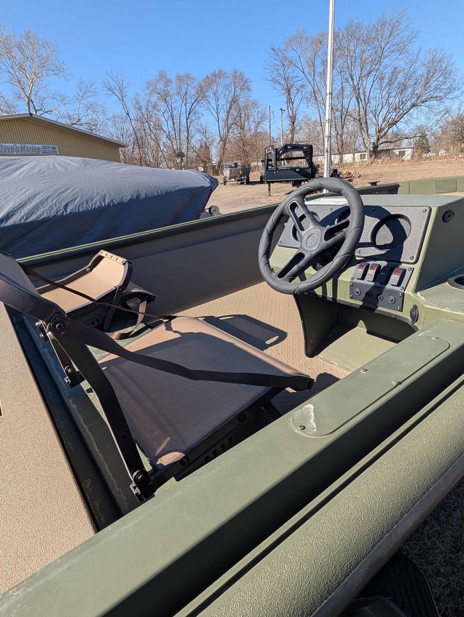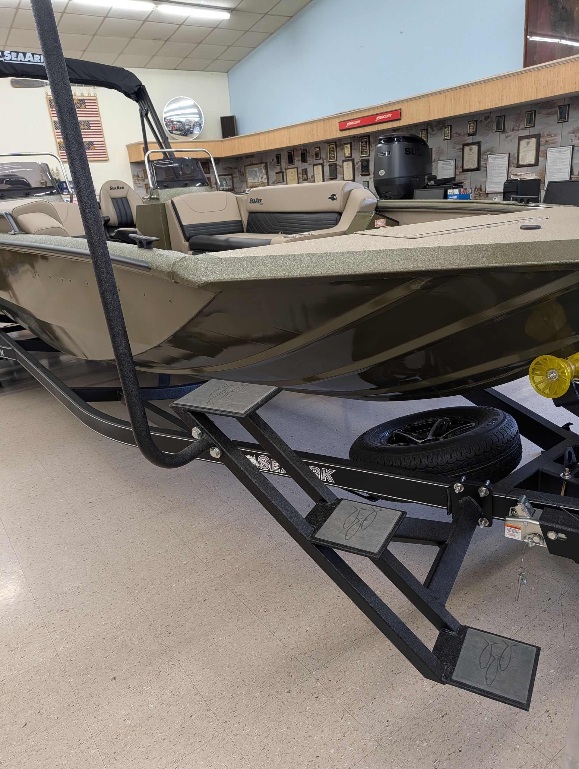 Options: Wooodland Green Exterior Paint, Sand Dune Tan Interior with Paint Splatter, Line-X Interior, Black Frame Bimini Top and Flotation Pods with Ladder. Deluxe Marine Master Trailer with J-Step. Click for Specs.
