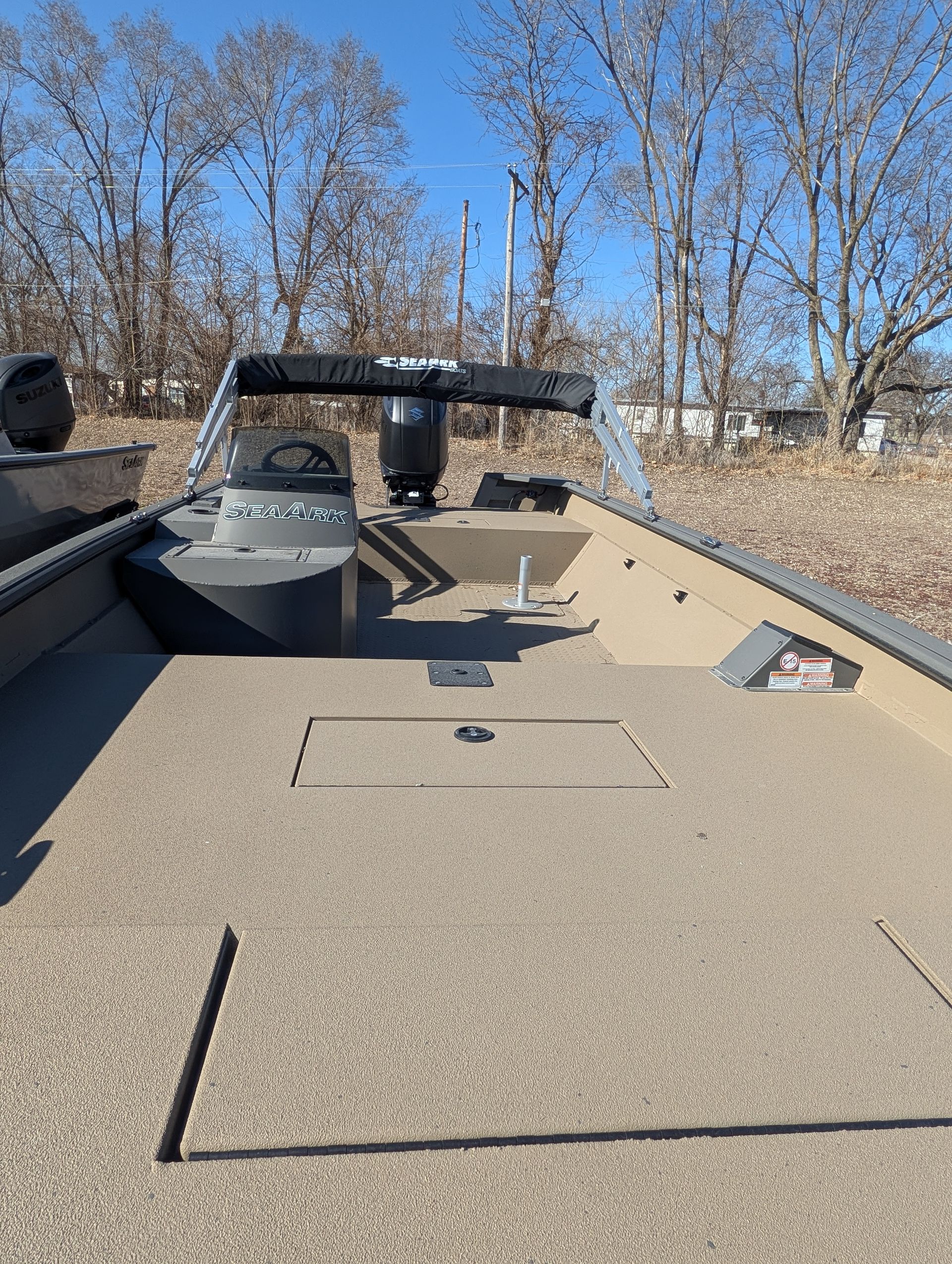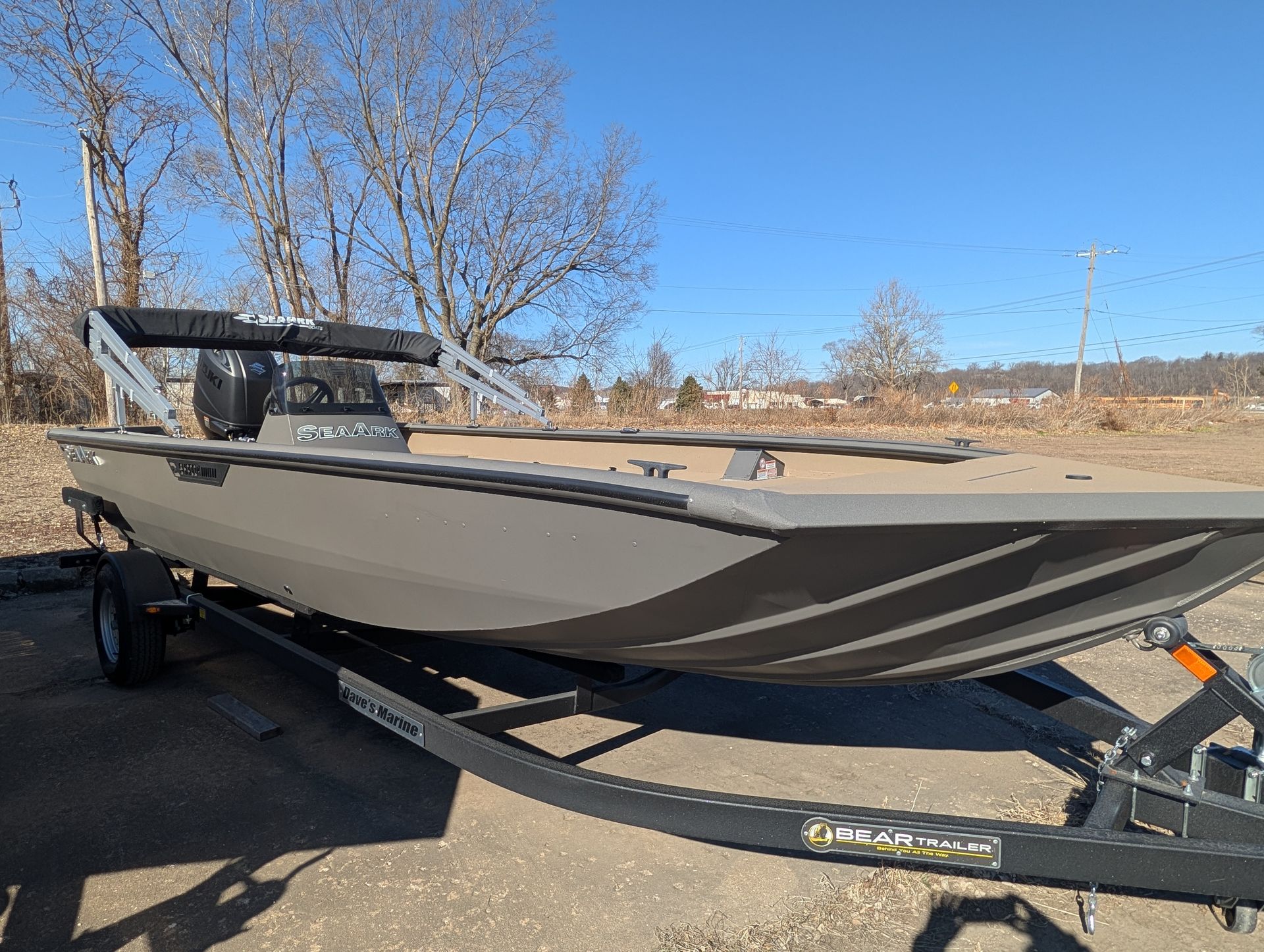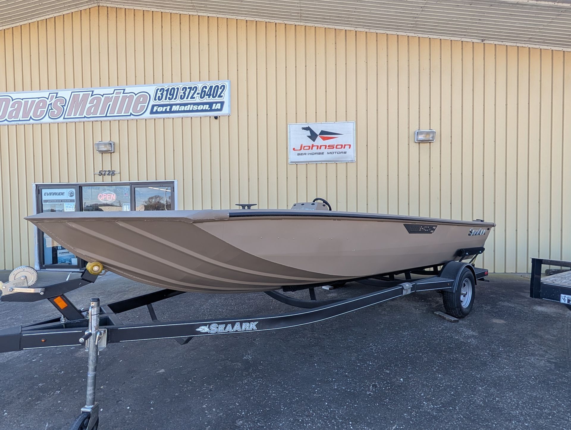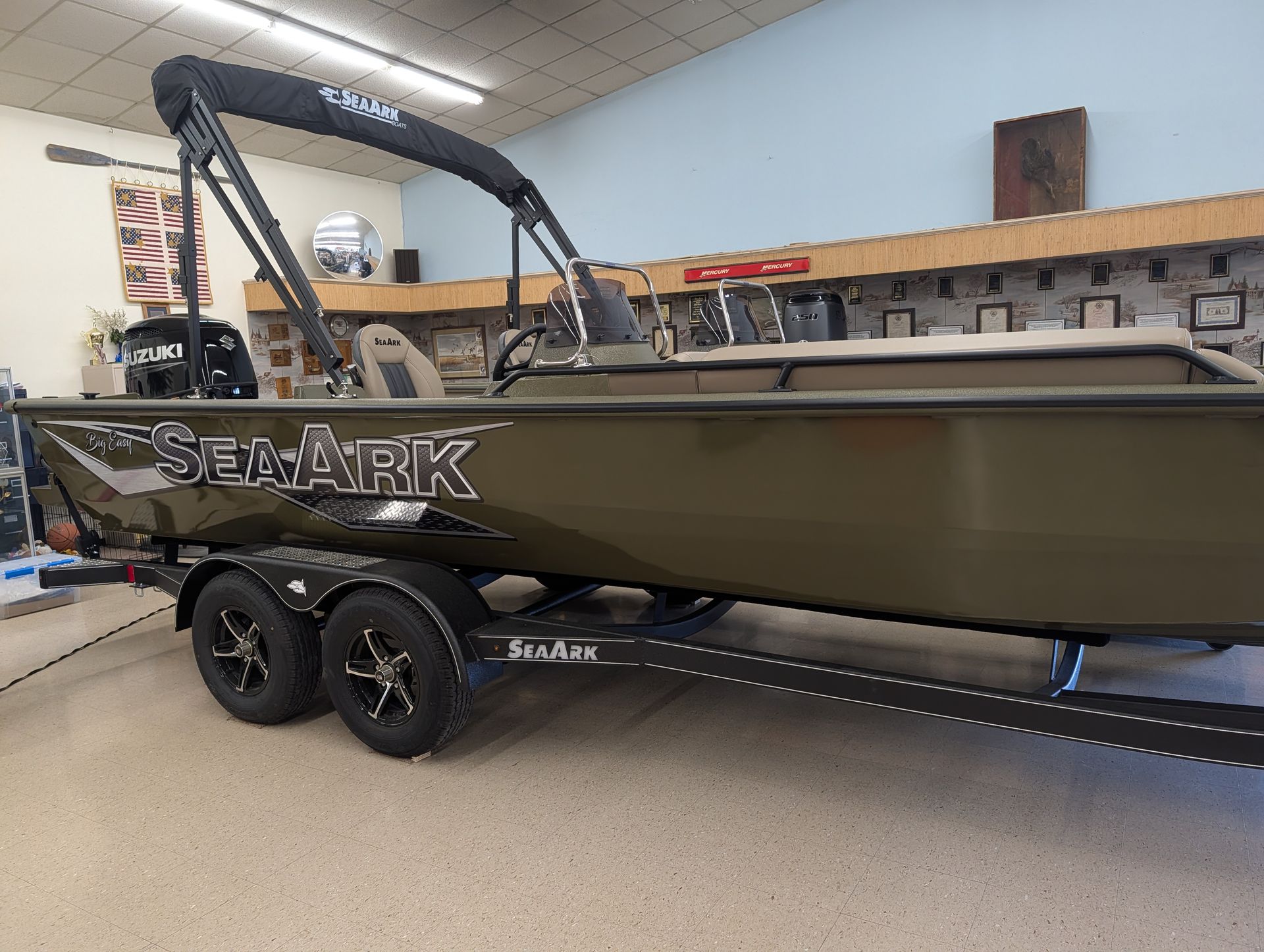 Options: Wooodland Green Exterior Paint, Sand Dune Tan Interior with Paint Splatter, Line-X Interior, Black Frame Bimini Top and Flotation Pods with Ladder. Deluxe Marine Master Trailer with J-Step. Click for Specs.