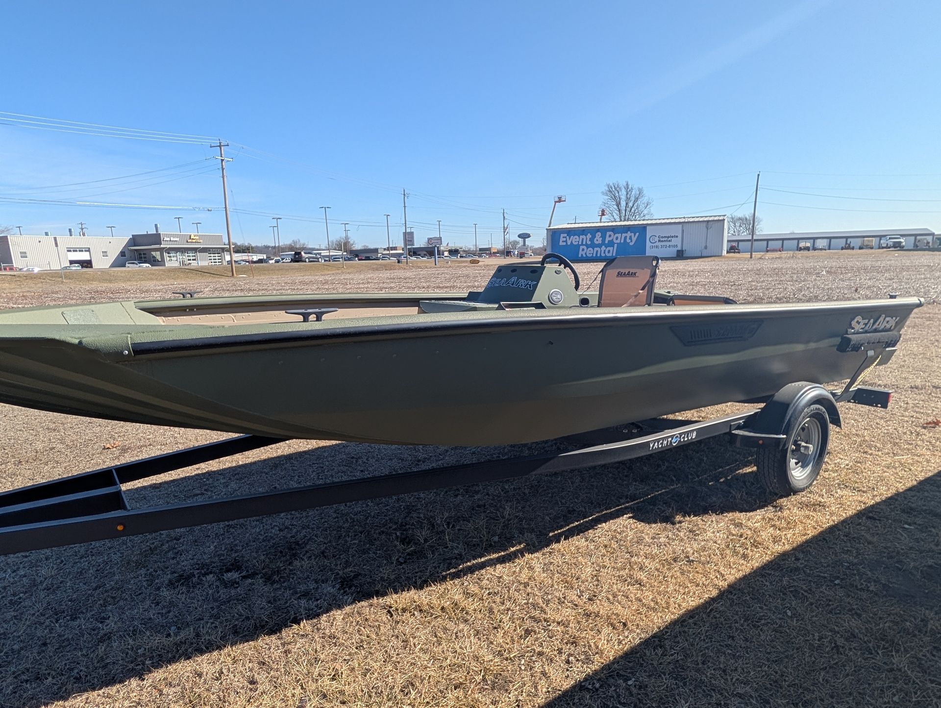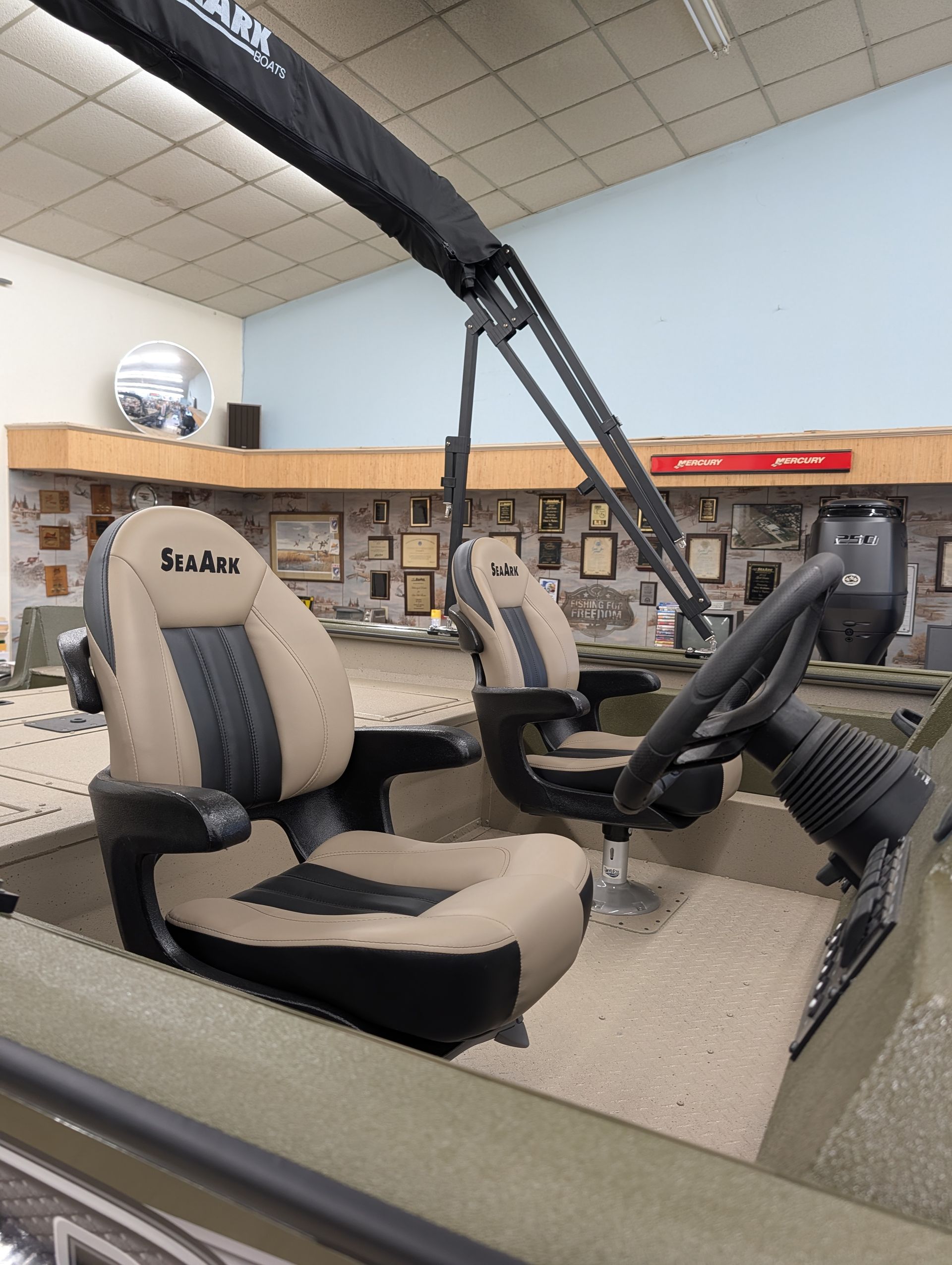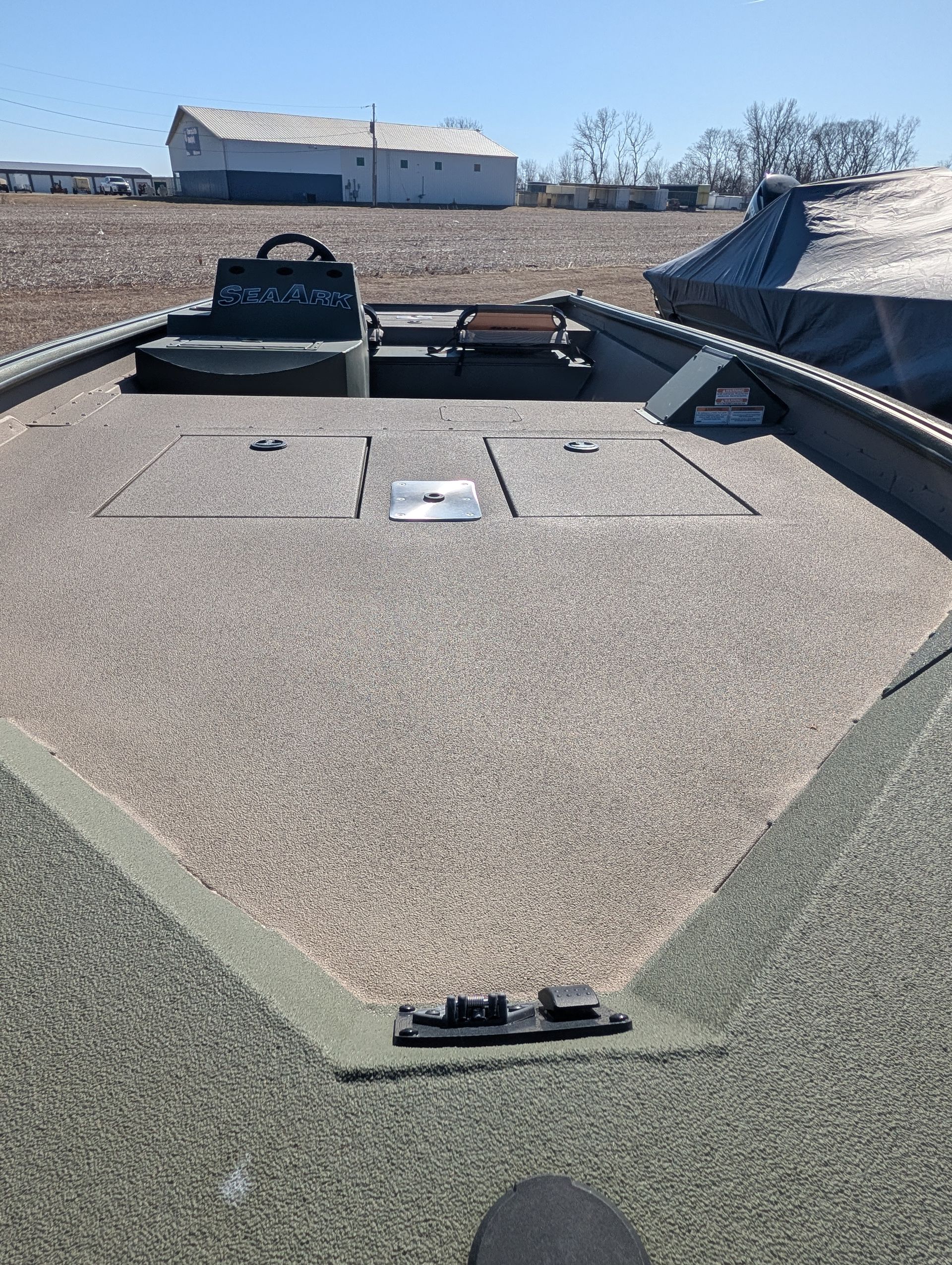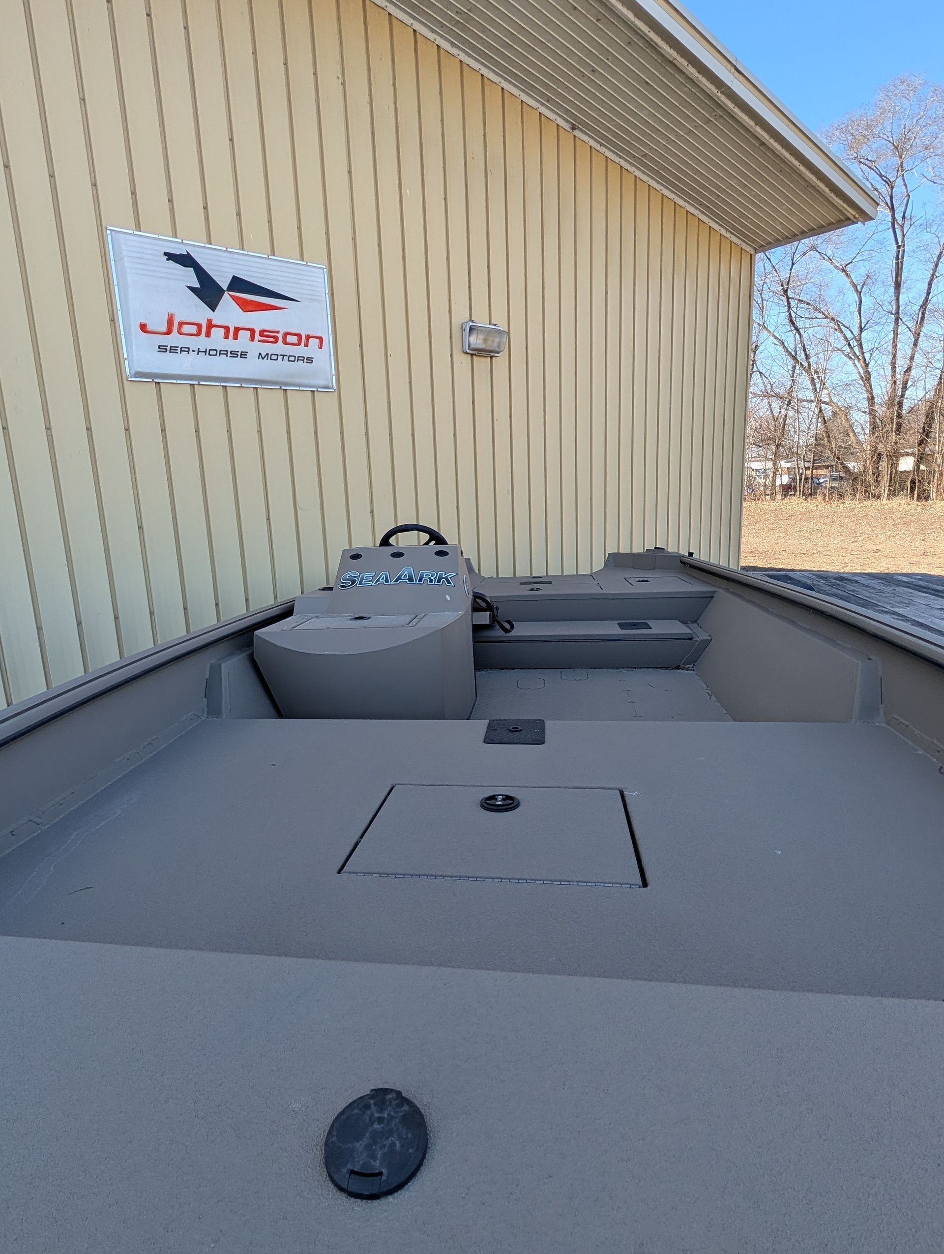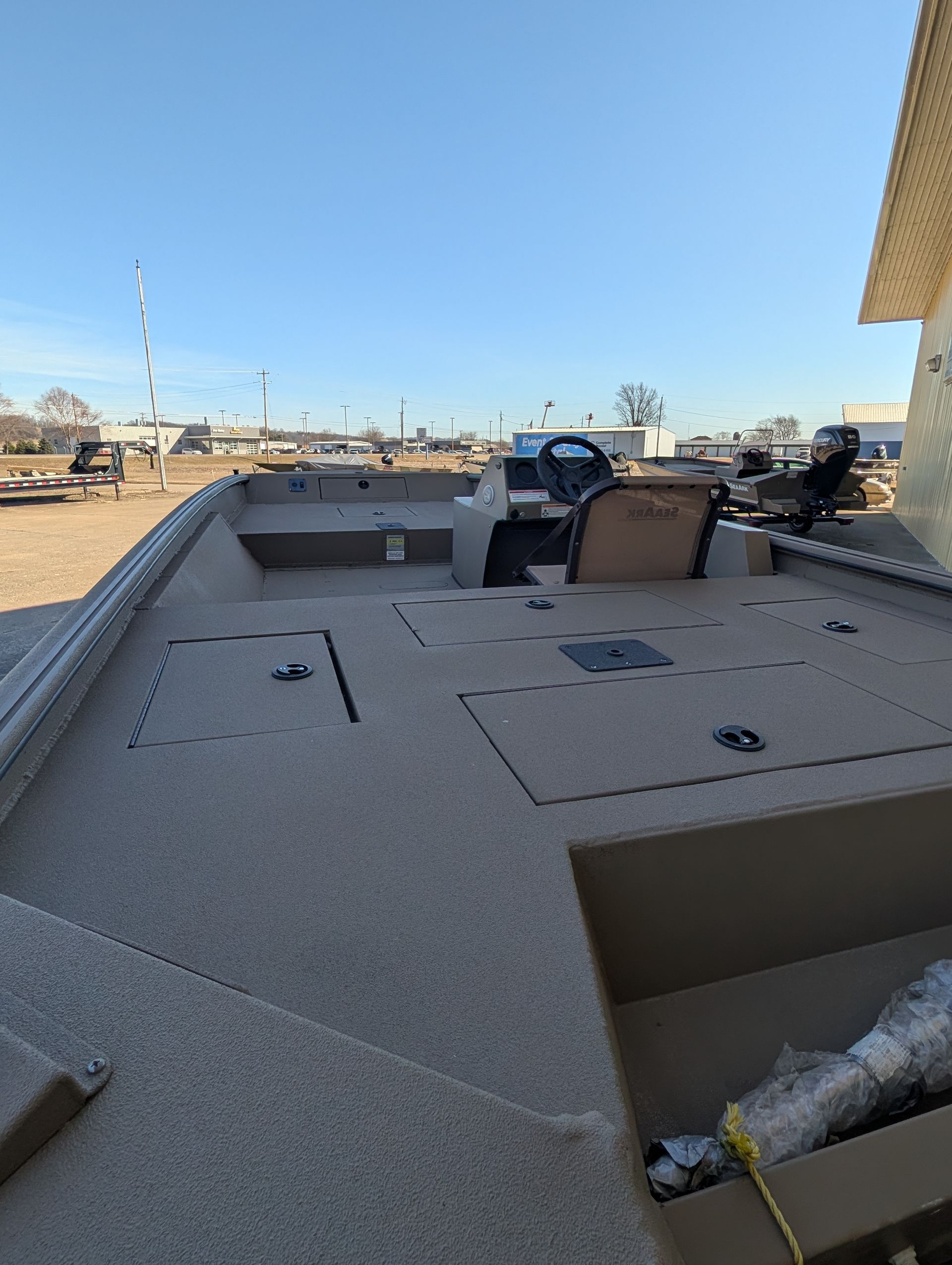 Options: Wooodland Green Exterior Paint, Sand Dune Tan Interior with Paint Splatter, Line-X Interior, Black Frame Bimini Top and Flotation Pods with Ladder. Deluxe Marine Master Trailer with J-Step. Click for Specs.