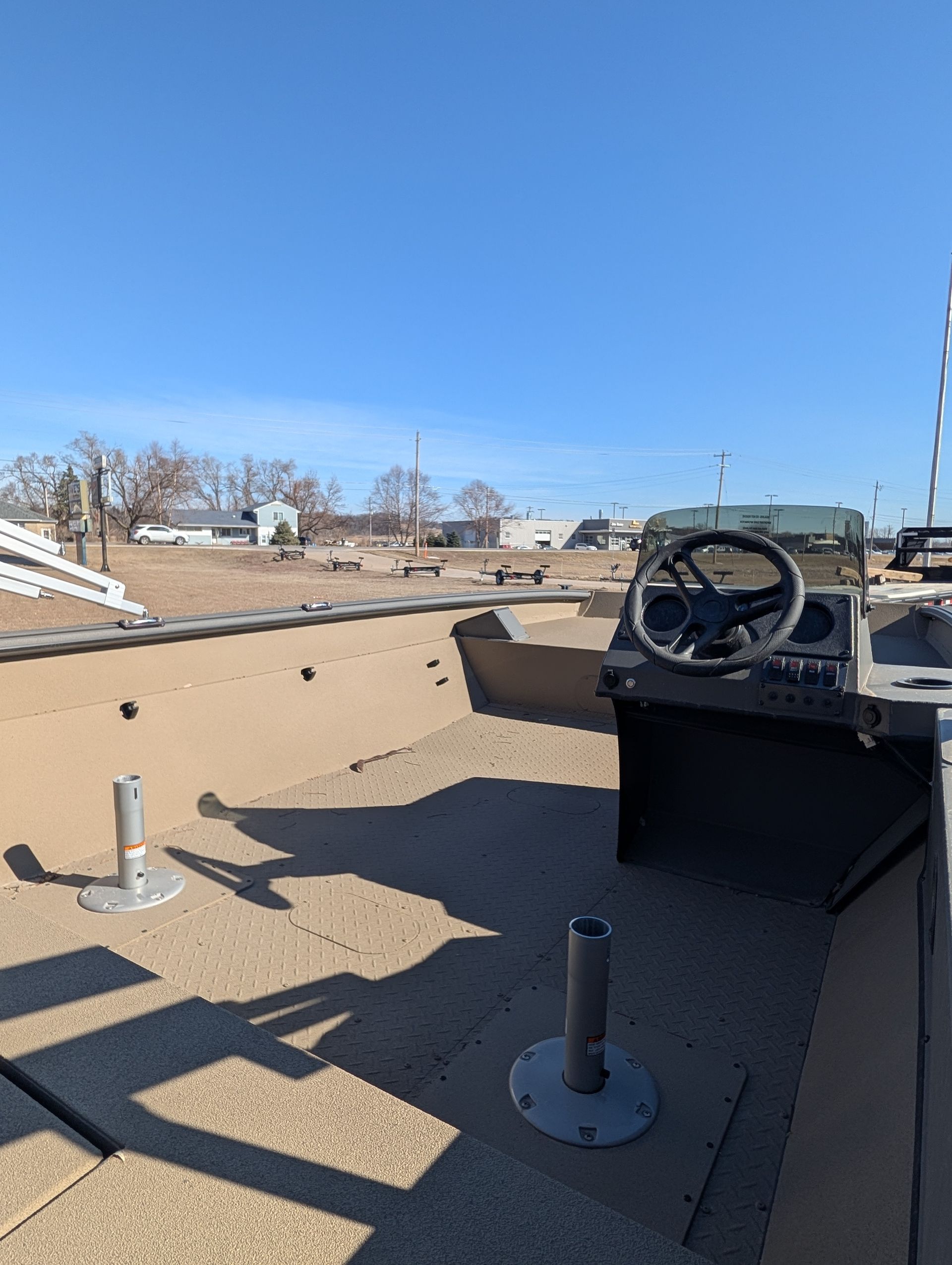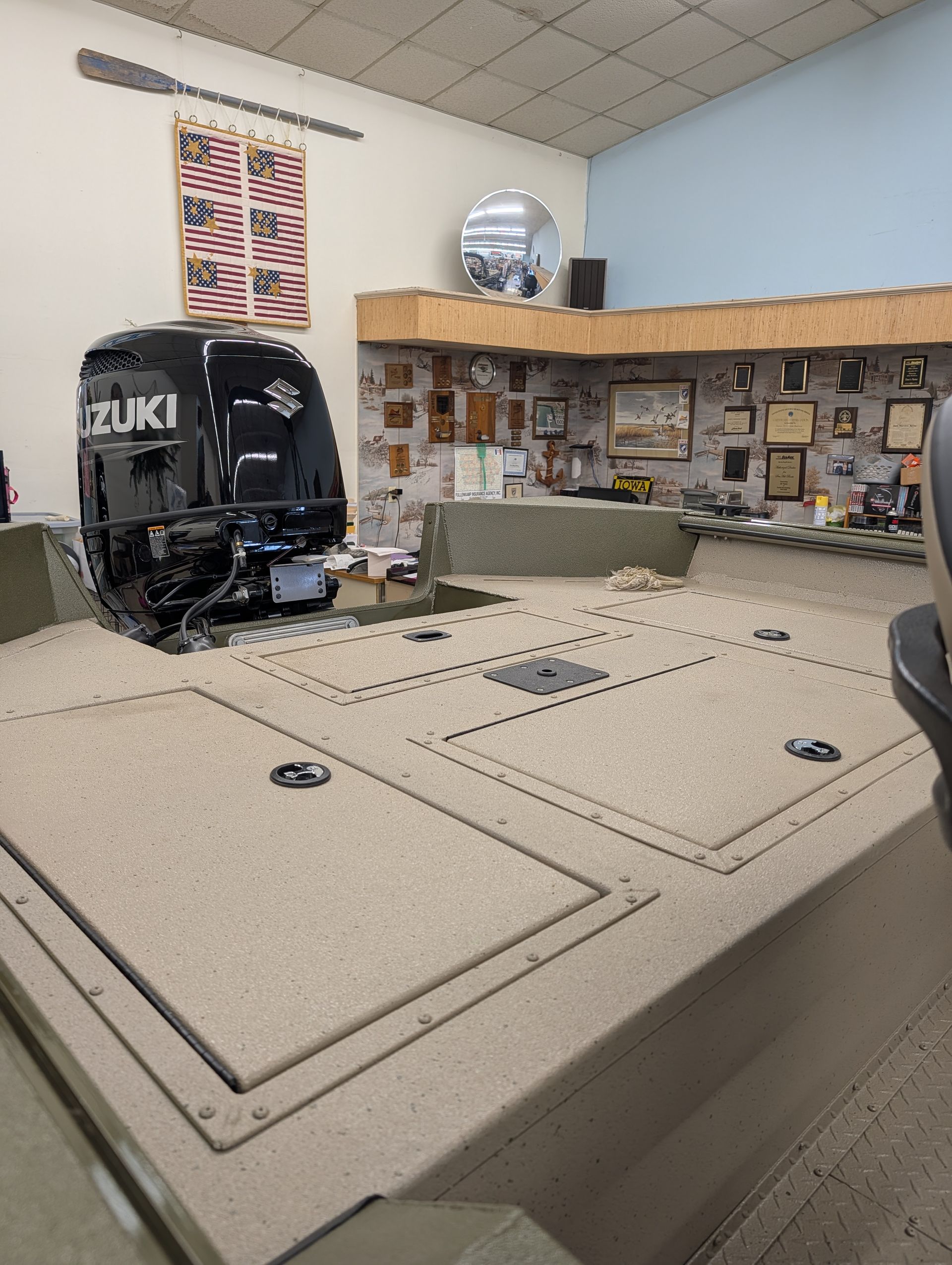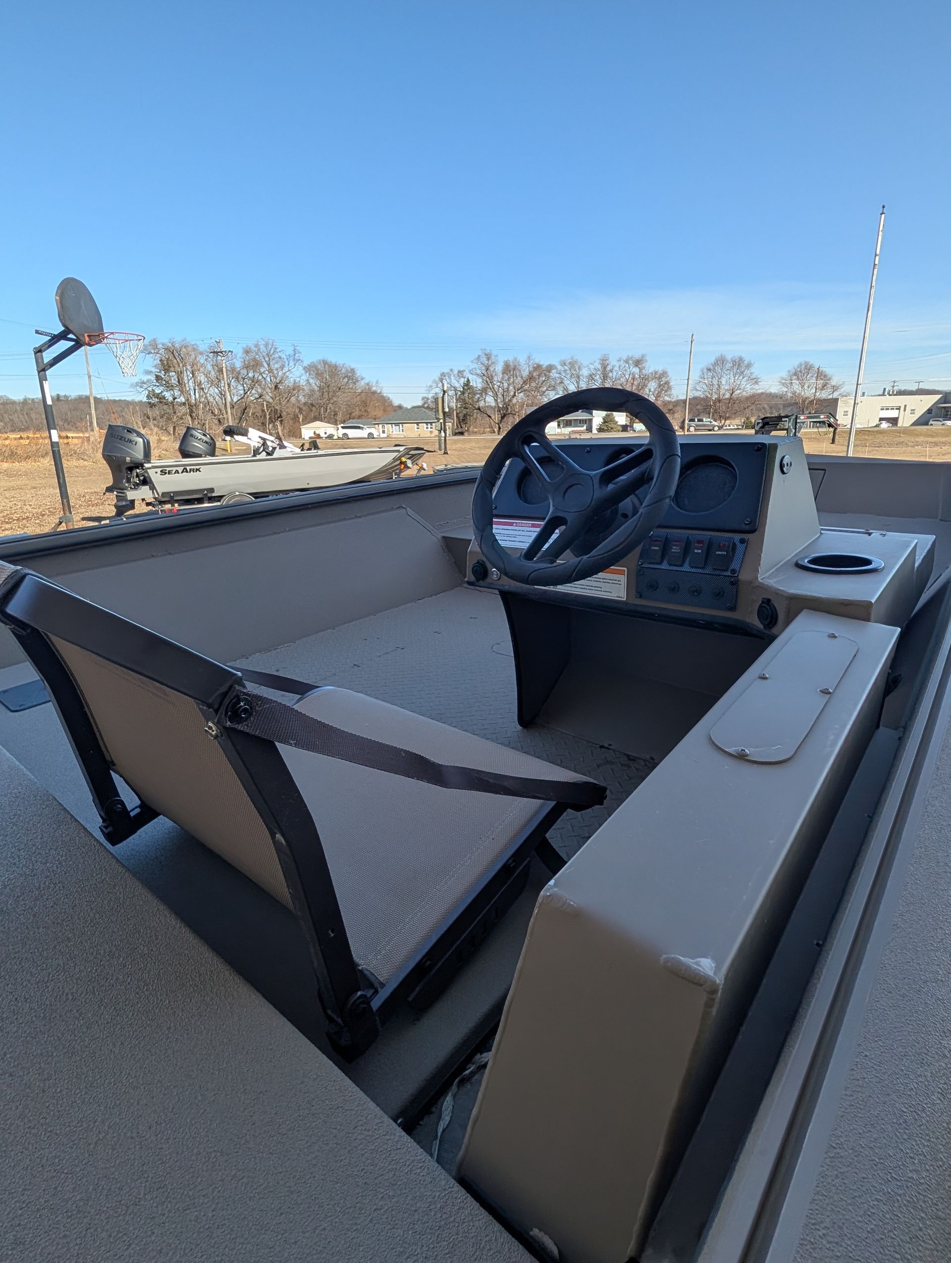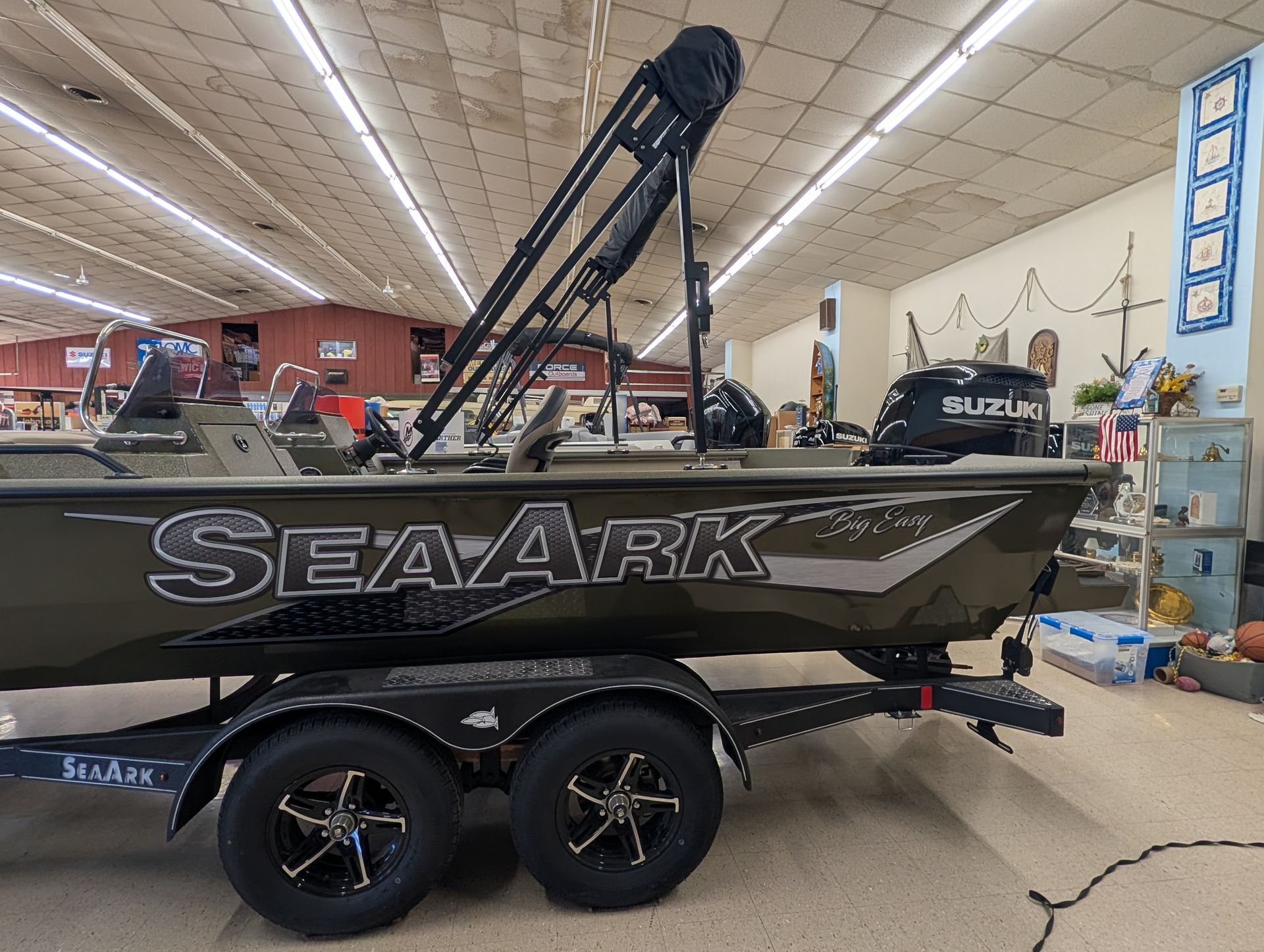 Options: Wooodland Green Exterior Paint, Sand Dune Tan Interior with Paint Splatter, Line-X Interior, Black Frame Bimini Top and Flotation Pods with Ladder. Deluxe Marine Master Trailer with J-Step. Click for Specs.