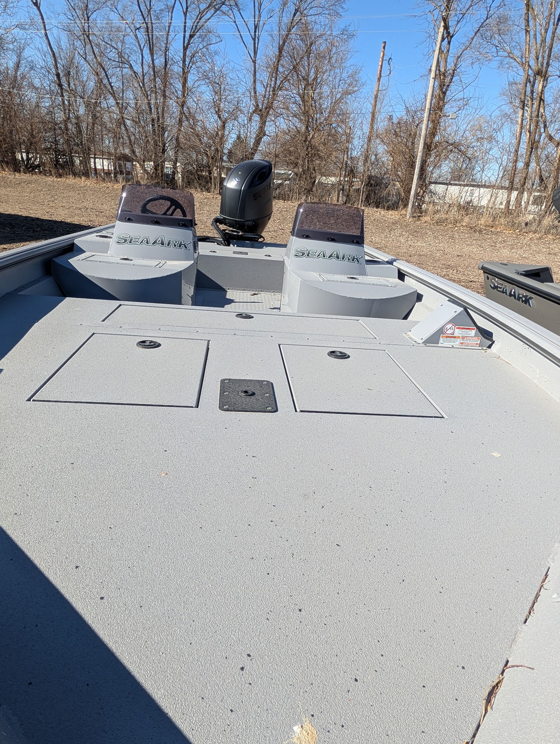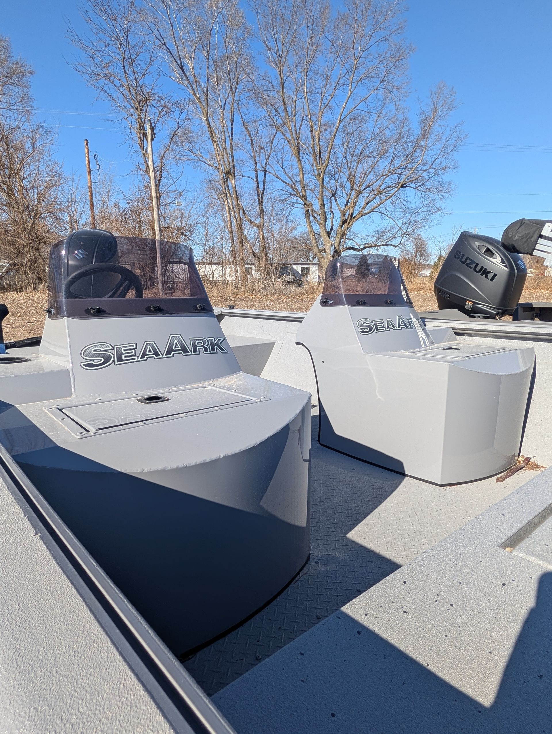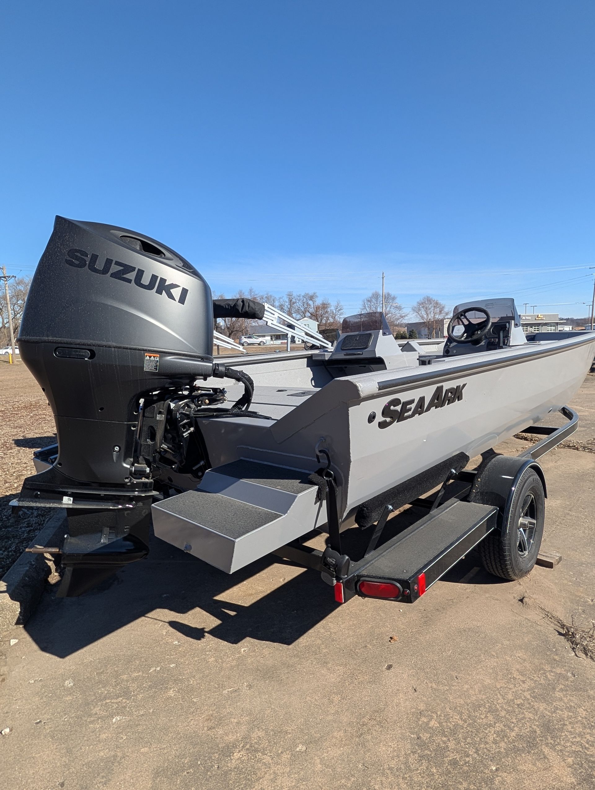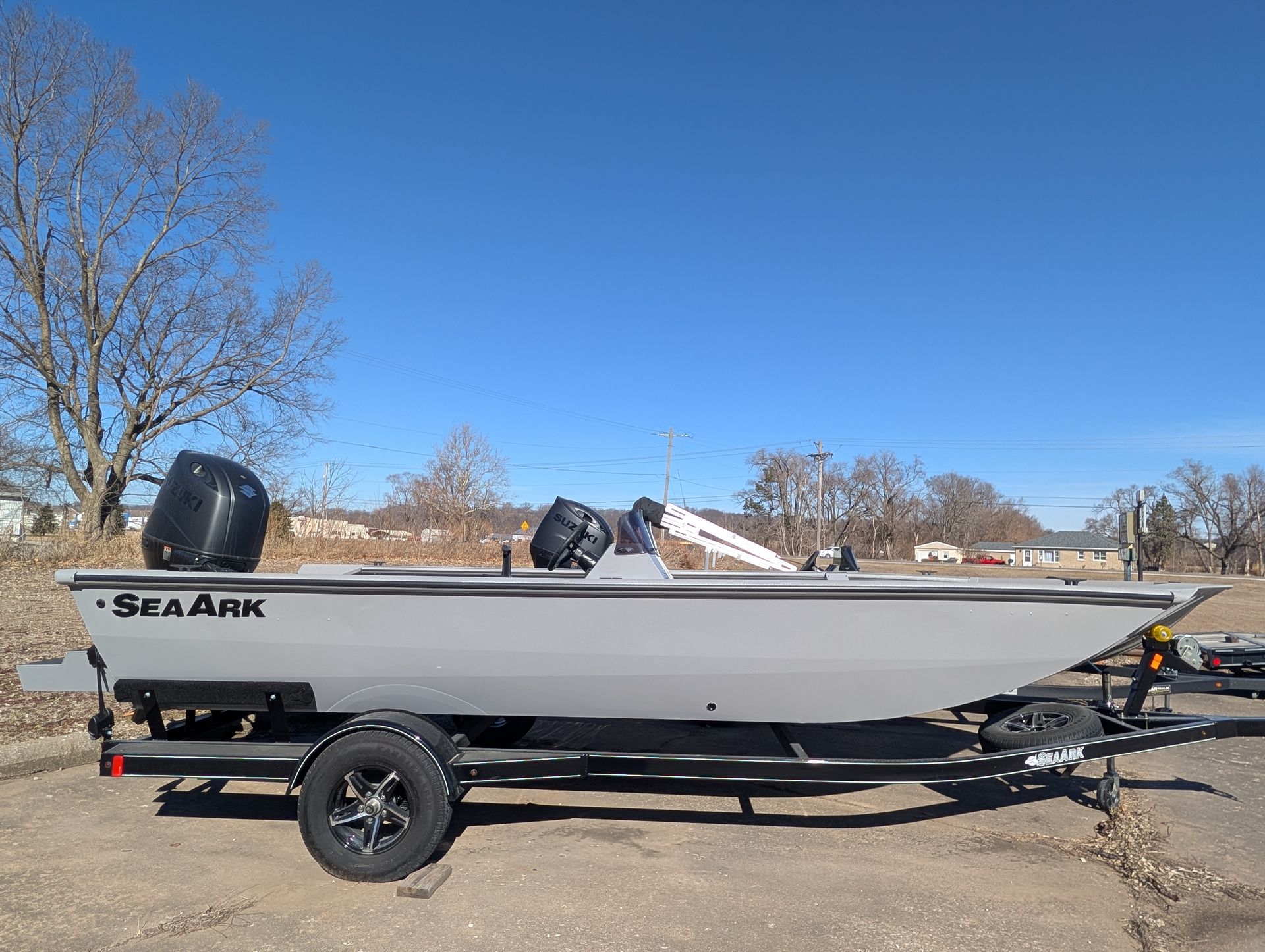 Options: Battle Gray Paint, Line-X Interior with Splatter Paint, Dual Consoles with Windshields, Elite Package, Flotation Pods with Ladder. Marine Master Trailer with Aluminum Wheel Upgrade. Click for Specs.